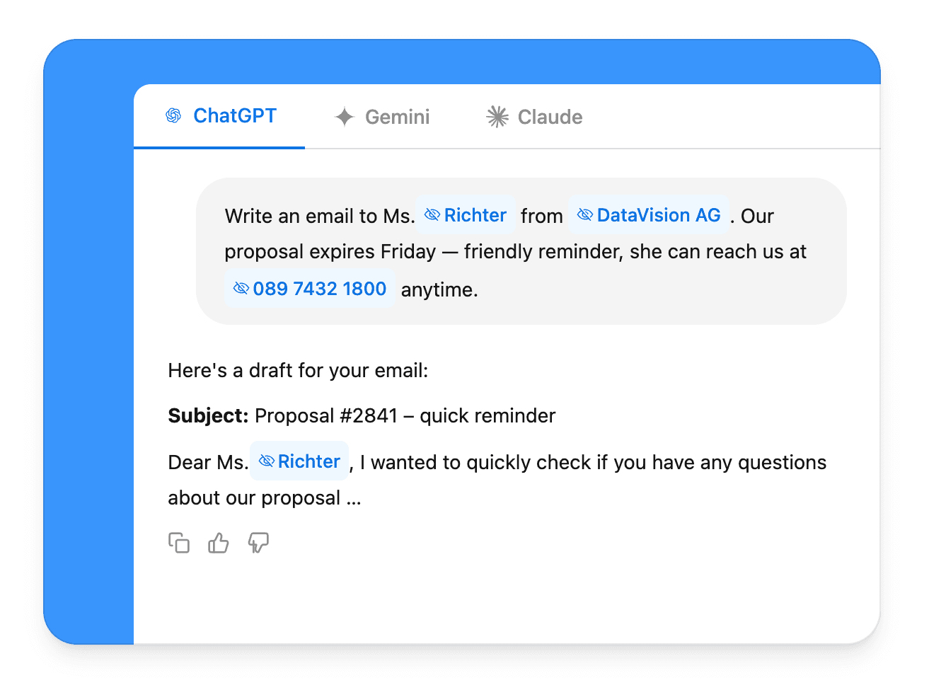 rehydra sits between your browser and the LLM provider. We anonymize PII in real-time, in your browser, allowing your team to use AI freely without sensitive data ever leaving your device.