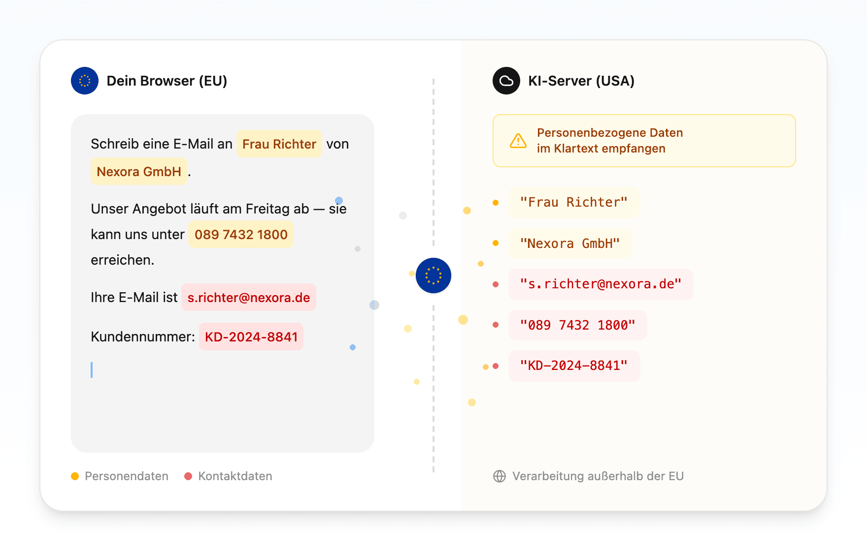 Du tippst deinen Prompt ganz normal in ChatGPT, Claude oder Gemini -- mit echten Namen, Adressen, Vertraegen.